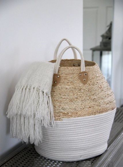 Containers hide clutter while adding natural texture.